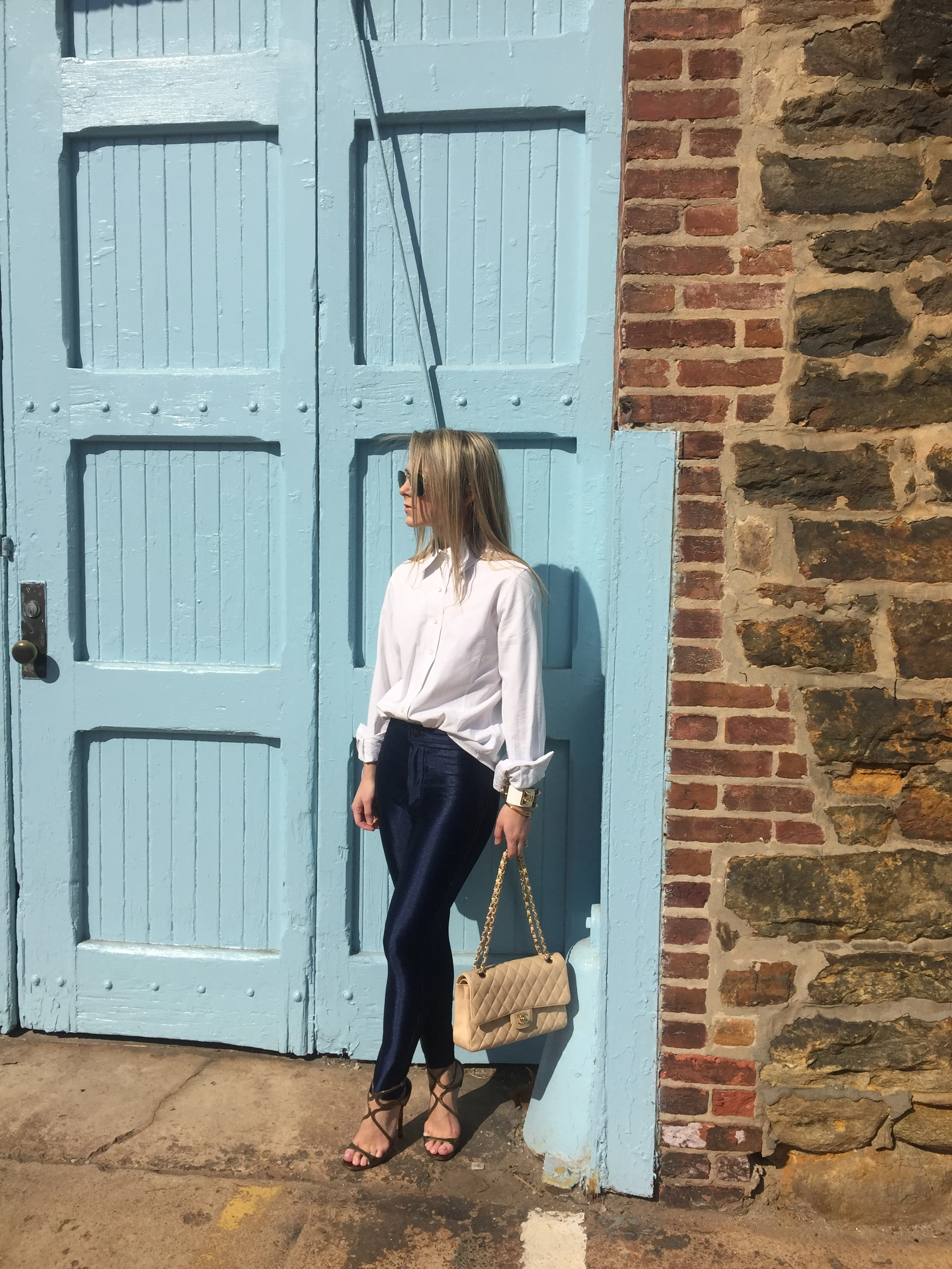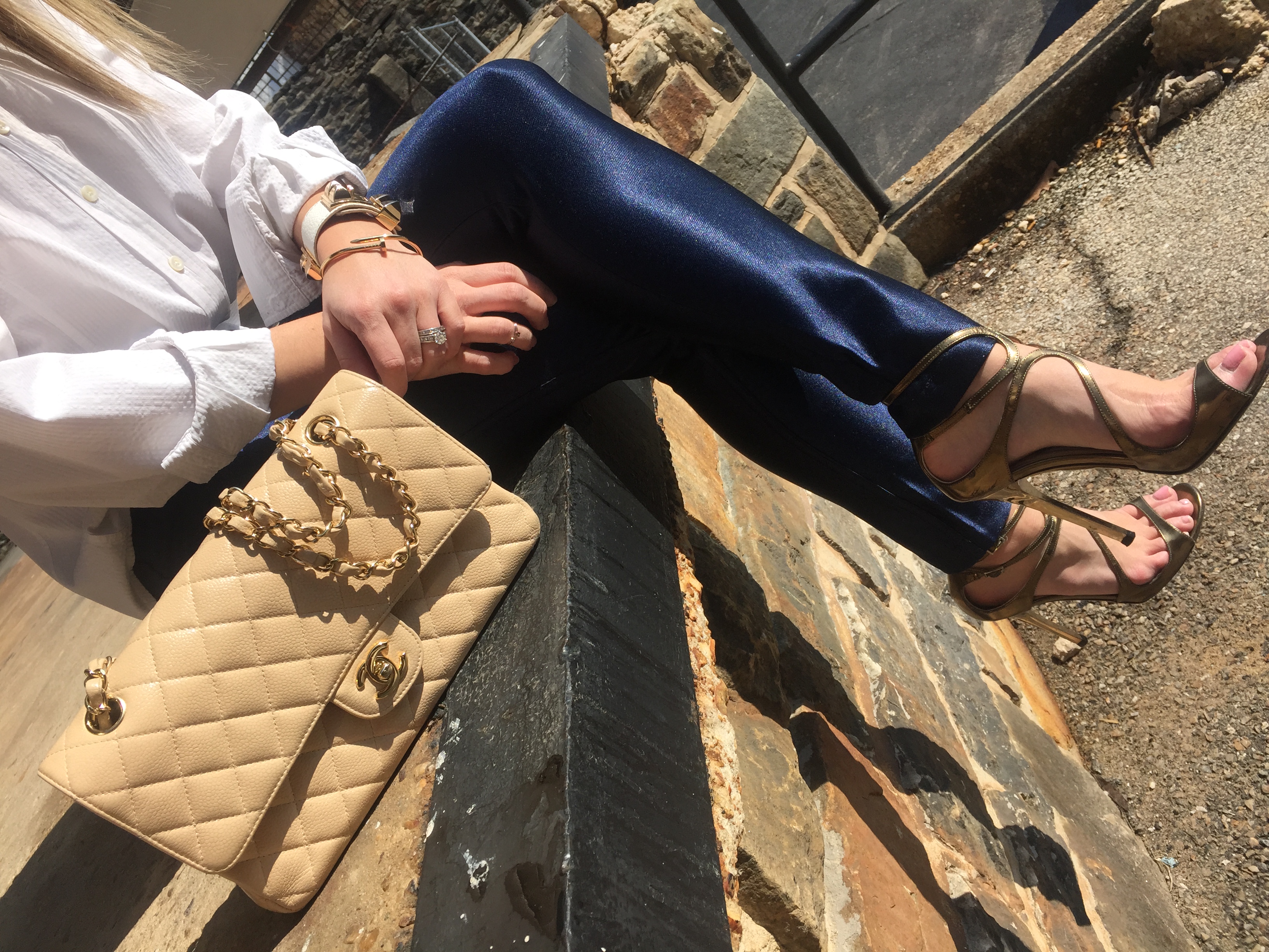 Shop the post || White button down: Faconnable || Hot Pant: American Apparel || Gold Sandals: Jimmy Choo || Bag: Chanel Classic flap bag in Caviar leather available in Chanel Boutiques || Earrings: gold hoops (similar) || Sunglasses: Ray Bans