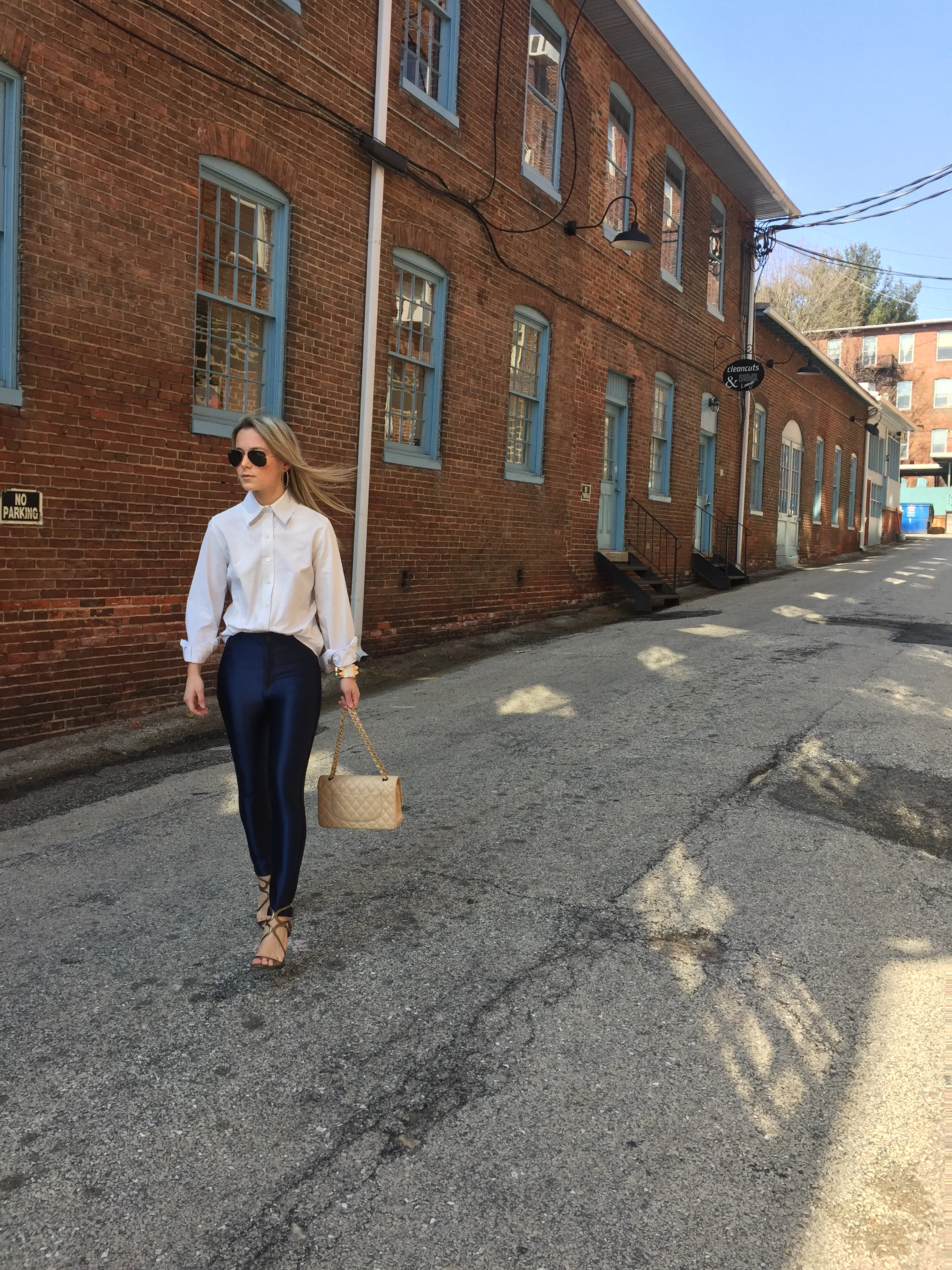 For today's OOTD I was inspired by these American Apparel Hot Pants! It's Saturday, so I thought they would make today's look extra fun. Being that these pants can be loud, I decided to pair them with neutrals and metallics to keep the rest of the look clean and simple. I chose a white classic button down and decided to button it up all the way up for a more crisp look. When selecting the shoes, I had a couple of options but ultimately decided on the gold sandals. For the accessories, I chose a nude bag and white and gold leather cuff and gold hoop earrings.